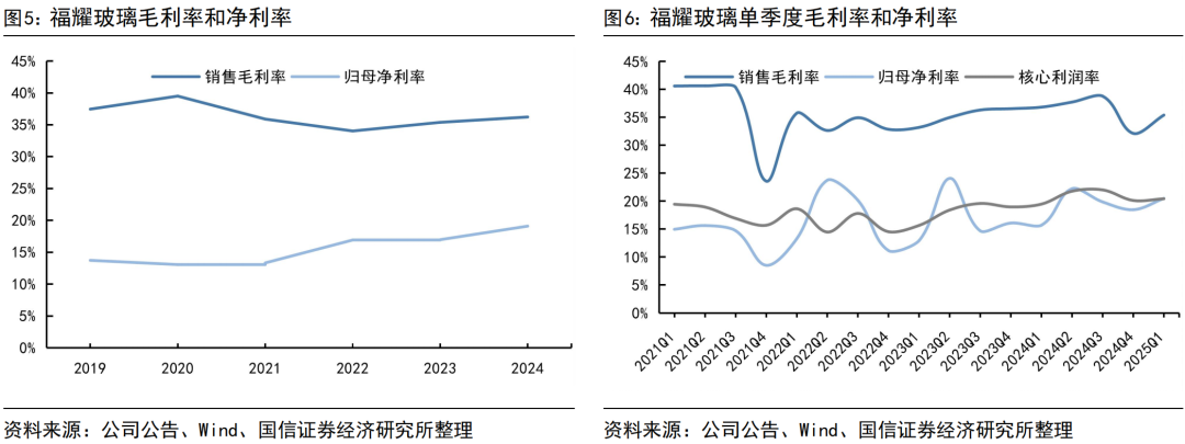 四个阶段造就龙头福耀。汽车玻璃行业呈现出寡头垄断的格局,福耀玻璃国内市场占有率超过70%,全球市占率超过36%,是汽车玻璃巨头供应商内最年轻也是发展最快的成员。我们总结福耀玻璃的核心竞争力在于产能快速铺设、产业链纵向延伸及重资产重人口行业的基因红利,竞争结果上体现为公司的高毛利率、高市场份额,追溯福耀集团历史及其创始人曹德旺先生的履历,我们认为公司核心竞争力形成于以下几个关键时点。1)1987年成立中外合资耀华玻璃;2)1995年专注主业,打造“福耀”品牌,上市后加速产能扩建;3)1999年圣戈班暂时退出中国市场,福耀持续推进国内布局;4)2004年自制浮法玻璃,完善产业链自主可控;5)2015年加速出海,海外建厂赋能全球车企;6)2020年位居全球汽车玻璃龙头,进入价量双升新成长周期。目前福耀已在全球占据36%以上汽车玻璃市场份额,具备海外(欧洲、北美)布局且盈利能力持续改善,受益于单车玻璃价格提升,当下时点业绩确定性强,价值凸显。
