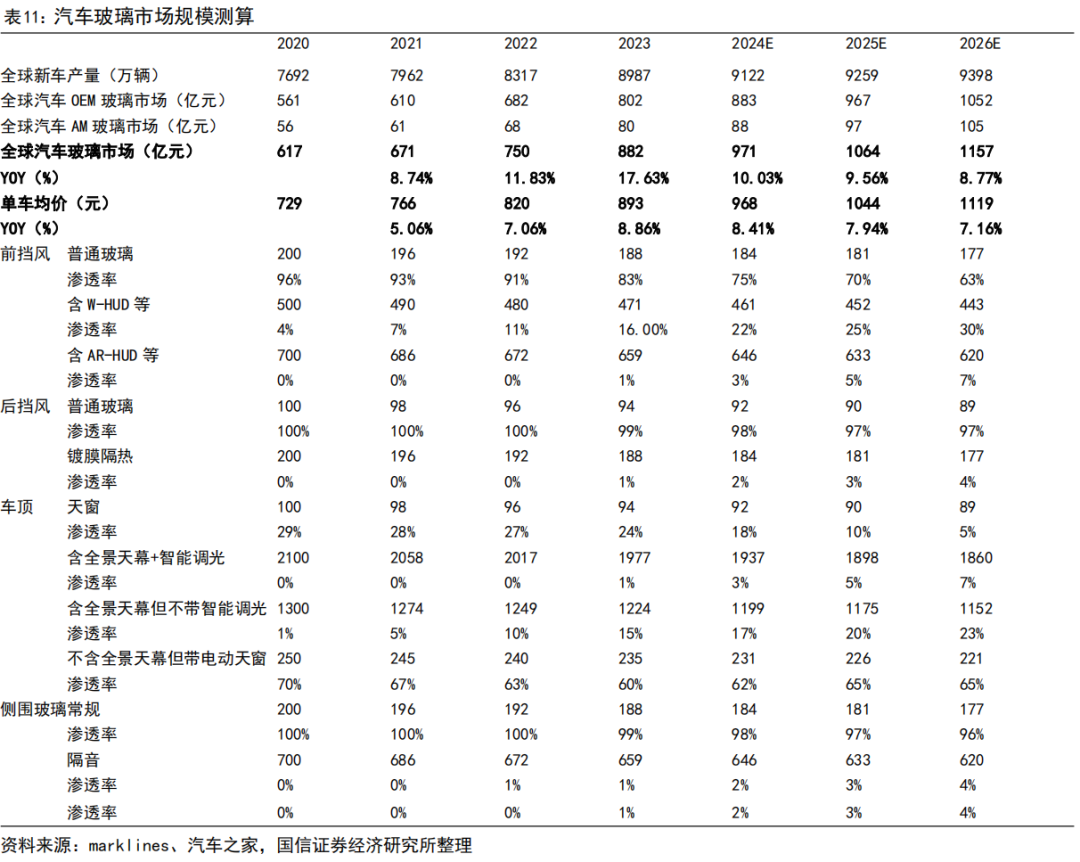 福耀配套玻璃价值有望从1000元向2000元以上加速增长。目前福耀已经在汽车玻璃关键成型工艺和设备、玻璃天线、镀膜、光电等核心技术领域实现突破,陆续研发出轻量化超薄玻璃、镀膜可加热玻璃、抬头显示玻璃、超隔绝玻璃、带网联天线的ETC RFID 5G玻璃、智能全景天幕玻璃等。具体到车端则体现为天幕向镀膜升级、前挡向HUD升级、侧窗向隔音玻璃升级,单车价值从此前的600元向1000元、2000元水平增长,公司远期增量可期。