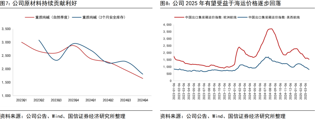 原材料价格贡献利好,后续有望持续受益于原材料及海运价格回落。公司核心原材料重质纯碱价格持续下降,2025Q1国内价格基本维持1500-1600元/吨,同比去年一季度2936-2000元/吨价格明显下降,原材料持续贡献利好。向后展望,全年维度公司一方面受益于纯碱低价利好,一方面受益于自2024年3月开始上涨的海运费价格回落,伴随规模效应持续兑现,公司盈利能力提升可期。