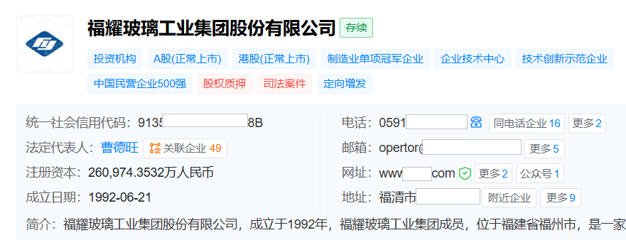 福耀玻璃成立于1992年,前身是创始人曹德旺于1987年联合股东集资成立的福耀玻璃有限公司。1993年,福耀玻璃在上交所主板上市,成为福建省最早上市的民营企业和中国同行业首家上市公司。2015年,福耀玻璃在港交所上市,形成“A+H”模式。其主营业务是为各种交通运输工具提供安全玻璃和汽车饰件全解决方案,包括汽车级浮法玻璃、汽车玻璃、机车玻璃、行李架、车窗饰件等。