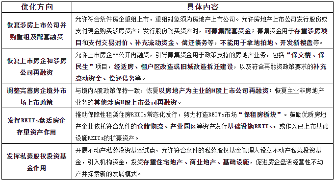 陆家嘴此次资产重组的大前提,是11月28日证监会发布了房地产行业股权融资方面调整优化措施。具体措施包括恢复涉房上市公司并购重组及配套融资;恢复上市房企和涉房上市公司再融资;调整完善房地产企业境外市场上市政策;进一步发挥REITs盘活房企存量资产作用;积极发挥私募股权投资基金作用。