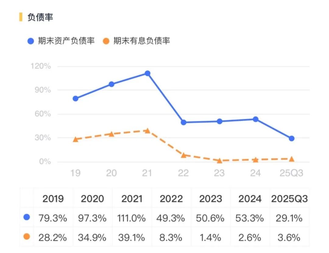 截至2025年三季度末,公司总负债从9.7亿元锐减到4.7亿元,降幅超过一半。资产负债率2024年末的53%骤降至29%,这相当于一个家庭把房贷从“有点吃力”降到了“基本不慌”的水平。