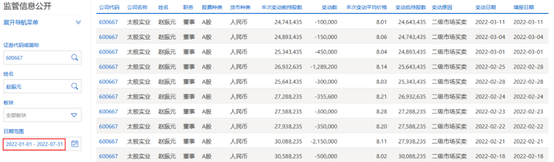 据上交所数据,2022年1月1日至7月31日期间,赵振元合计减持太极实业的594.48万股股份,其中2022年2月合计减持494.48万股,占期间减持总股份的83.18%。