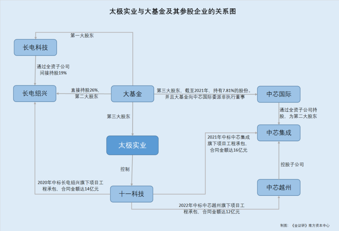 由上可知,大基金间接持有中芯集成的股份。2021年7月,太极实业披露其子公司中标中芯集成旗下项目工程承包,合同金额达16亿元两天后,大基金即公告其将减持太极实业股份。而后8月,大基金完成减持。