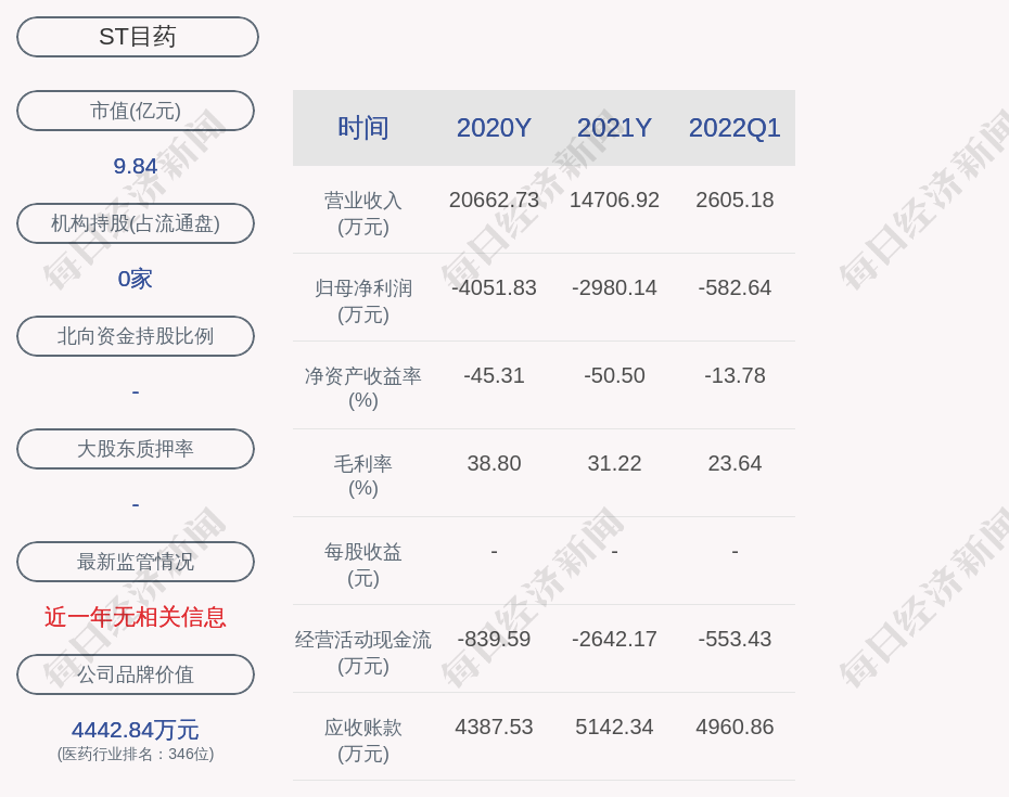 每经AI快讯,ST目药(SH 600671,收盘价:8.08元)发布年度业绩报告称,2021年营业收入约1.47亿元,同比减少28.82%;归属于上市公司股东的净利润亏损约2980万元;基本每股收益亏损0.24元。
