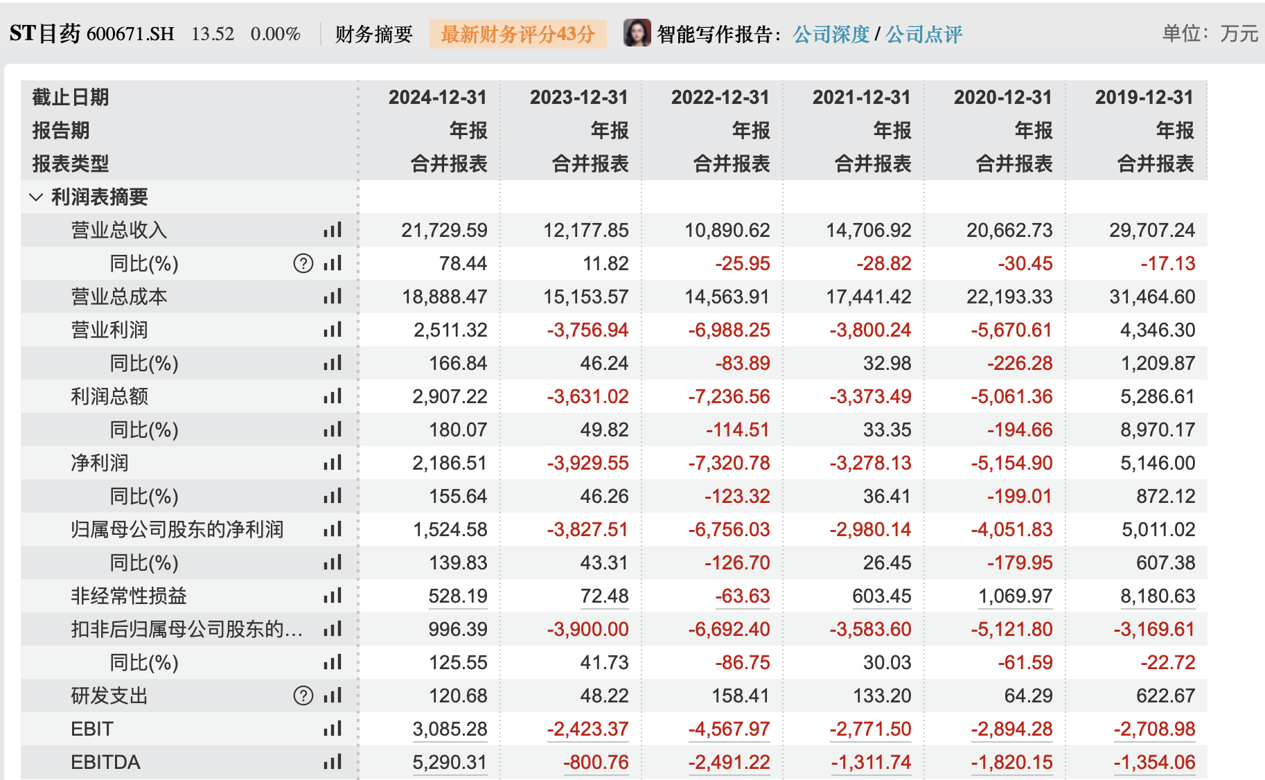 ST目药在公告中介绍,2024年度,公司经营状况不断向好,持续经营能力已得到明显改善。尤尼泰振青会计师事务所(特殊普通合伙)(以下简称“尤尼泰振青”)对公司2024年度财务报告进行了审计并出具标准无保留意见的《审计报告》(尤振审字[2025]第0197号)。经审计,2024年度归属于上市公司股东净利润为1524.58万元,扣除非经常性损益的净利润为996.39万元。