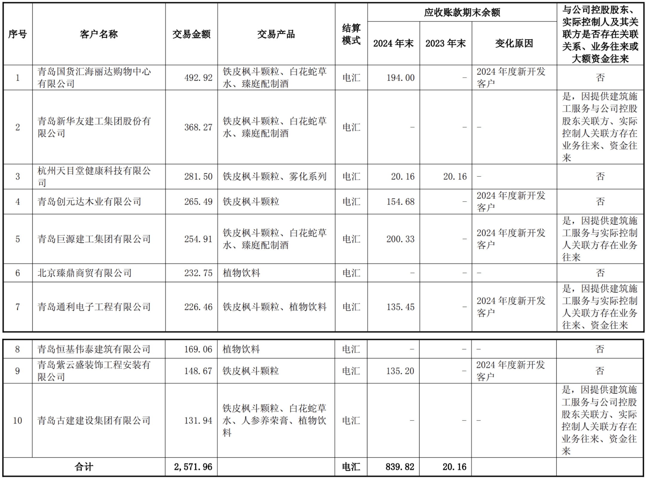 天目药业方面表示,公司实控人崂山区财政局履行出资人职责的部分区属国企与天目药业2024年保健品业务前十大客户有业务往来或资金往来,主要是区属国企通过市场化招标及相关方式依法依规开展建筑施工业务。除此之外,不存在其他关联关系、业务往来或资金往来关系。