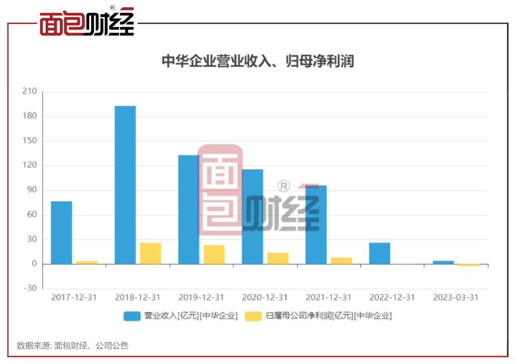 此外,2019年以来,中华企业业绩持续下滑。2023年一季度,公司营收同比减少43.52%,归母净利润同比下降145.28%。