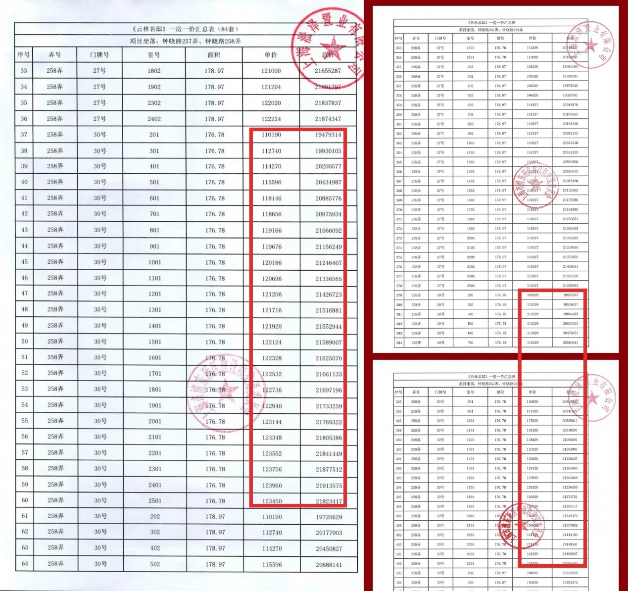 以钟晓璐258弄30号楼201为例,同样的176.78㎡面积,2023年备案单价为108029元/㎡,总价1909.7367万元;而今年10月新公示的一房一价表中,单价已变为110190元/㎡,总价1947.9314万元。新价格单价上涨2161元/㎡,总价高出38.19万元。