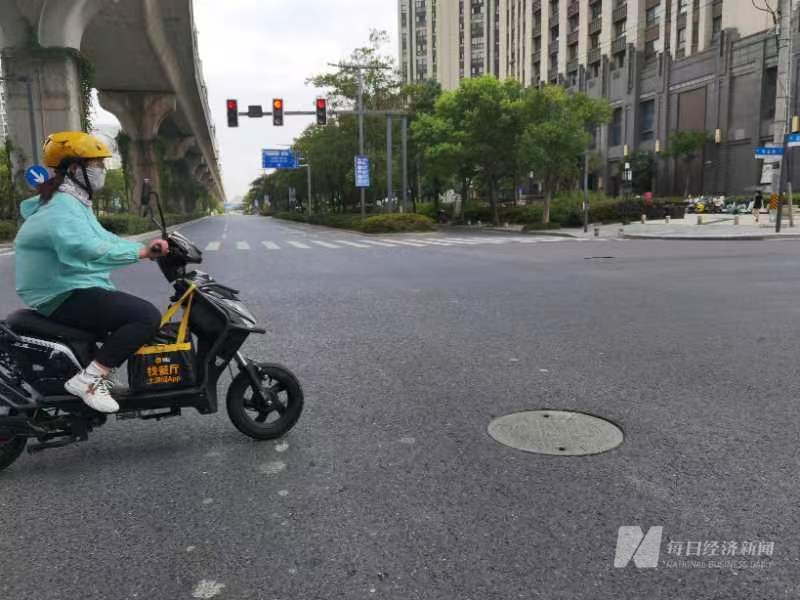 7月9日,上海街头,多数外卖小哥/小姐姐都罩着防晒套装图片来源:每经记者夏冰摄