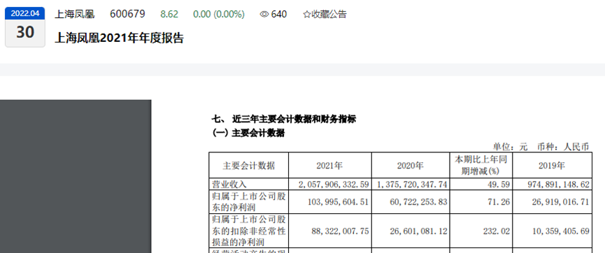 据上海凤凰2021年年度报告,公司2021年度营业收入20.58亿元,同比增长49.59%,归母净利润1.04亿元,同比增长71.26%,扣非归母净利润8832.2万元,同比大增232.02%。由此可见,上海凤凰当时业绩较为强劲。