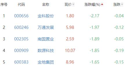 金科股份、万通发展、南国置业、数源科技、金地集团位列涨幅榜后五位,涨幅分别为-2.17%、-1.97%、-1.89%、-1.85%和-1.65%。