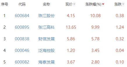 其中,珠江股份、张江高科、财信发展、泛海控股、海泰发展位列板块涨幅前五位,涨幅分别为10.08%、9.99%、5.78%、.45%、2.80%。