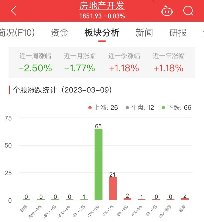 中国经济网北京3月9日讯今日,房地产开发板块整体跌幅0.03%,其中26只股票上涨,12只股票平盘,66只股票下跌。