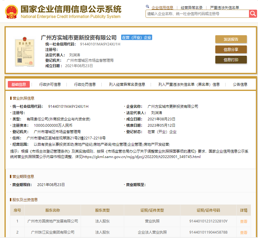 据乐居财经查阅,广州方实城市更新投资有限公司成立于2021-08-23,法定代表人为刘渊涛,注册资本为10000万元。公司经营范围包括以自有资金从事投资活动;房地产经纪;房地产咨询;物业管理等。该公司此前由广州市方圆房地产发展有限公司持股74%,广州珠江发展集团股份有限公司持股26%;目前由广州市方圆房地产发展有限公司持股74%,广州珠江实业集团有限公司持股26%。