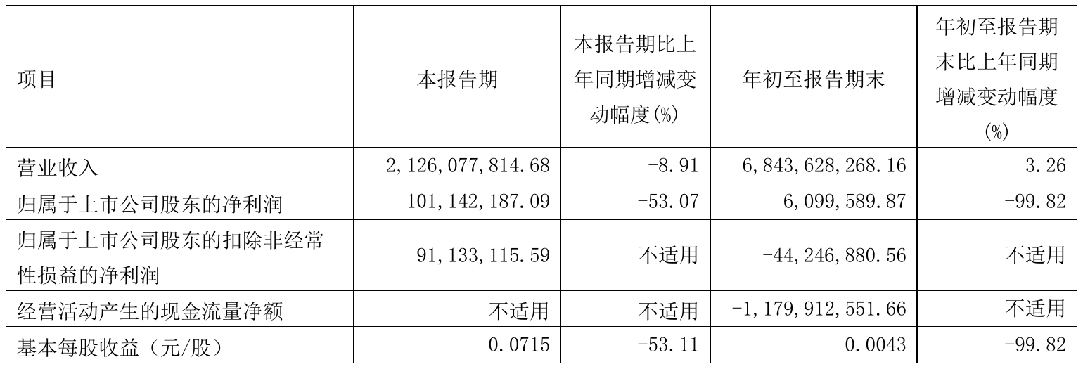 10月29日,中船防务(600685)近日发布2021年前三季度报告,报告期内营业收入6,843,628,268.16元,同比增加3.26%;净利6,099,589.87元,同比净利减少99.82%。