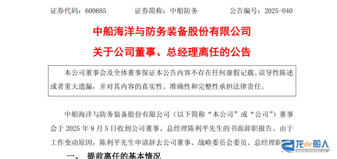 9月6日,中船海洋与防务装备股份有限公司(以下简称“中船防务”或“公司”)发布《关于公司董事、总经理离任》的公告。