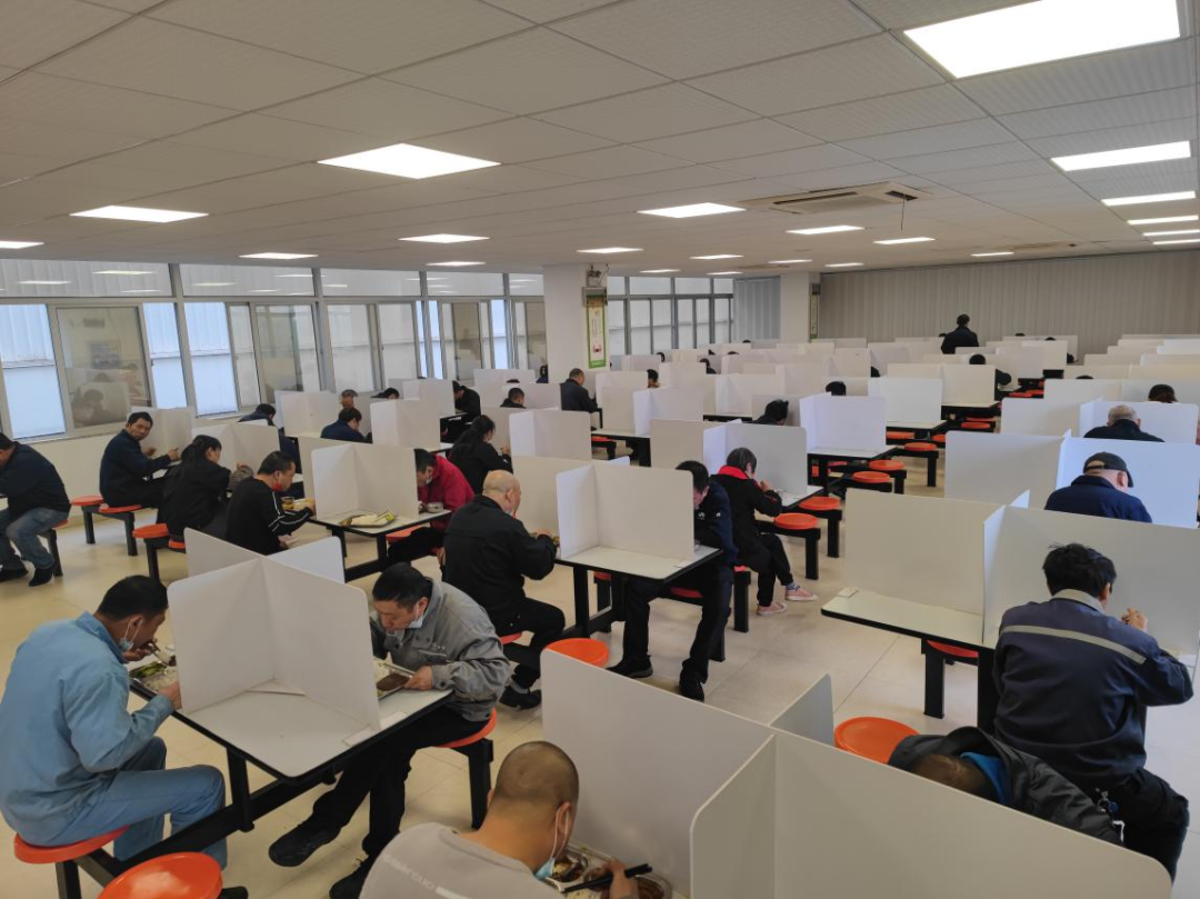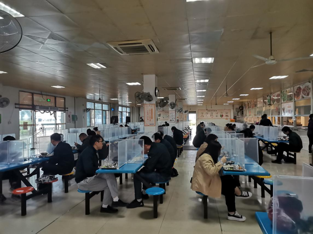 为降低新冠肺炎疫情传播风险,集团大力倡导推广分餐制,号召全体员工中午不外出堂食用餐,选择无接触外卖或食堂就餐,权属企业内部食堂采用分时段错峰就餐,桌椅设置隔断或保持间隔1米用餐。