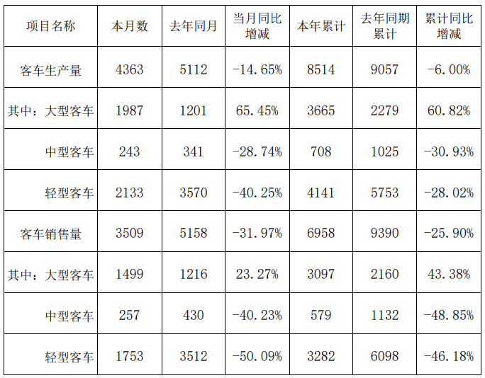 金龙汽车4月7日公告,3月份客车销售量为3509辆,同比下降31.97%;本年累计销售量为6958辆,同比下降25.90%。