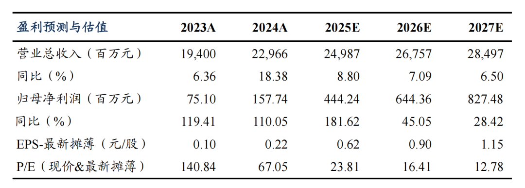 我们维持公司2025-2027年营业收入为250/268/285亿元,同比+9%/+7%/+7%,基本维持2025-2027年归母净利润为4.4/6.4/8.3亿元,同比+182%/+45%/+28%,对应PE为24/16/13倍。维持公司“买入”评级。