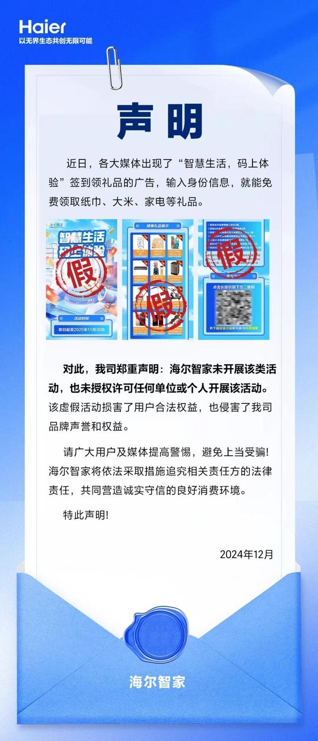 近日,一些媒体传播了关于海尔智家“智慧生活,码上体验”签到领礼品的虚假广告,声称输入身份信息即可免费领取纸巾、大米、家电等礼品。海尔智家对此郑重声明,公司并未开展此类活动,也未授权任何单位或个人进行相关活动。