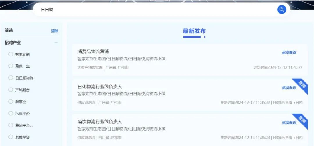 在海尔集团官网招聘一栏,输入“日日顺”关键词,可以搜到具体岗位。招聘人“智家定制生态圈”,隶属海尔智家旗下。