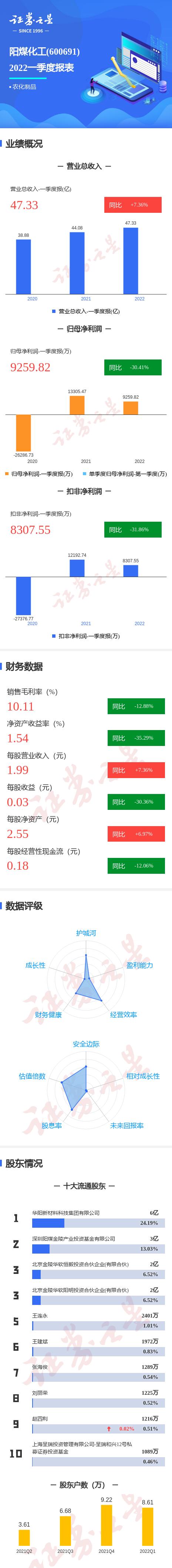 阳煤化工2022一季报显示,公司主营收入47.33亿元,同比上升7.36%;归母净利润9259.83万元,同比下降30.41%;扣非净利润8307.56万元,同比下降31.86%;其中2022年第一季度,公司单季度主营收入47.33亿元,同比上升7.36%;单季度归母净利润9259.83万元,同比下降30.41%;单季度扣非净利润8307.56万元,同比下降31.86%;负债率70.83%,投资收益-1.08万元,财务费用1.35亿元,毛利率10.11%。