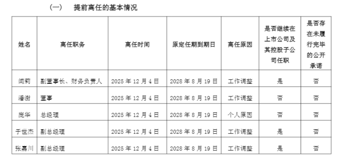 近日, 大商股份 发布公告称,该公司副董事长兼财务负责人闫莉、董事潘澍、总经理庞华以及副总经理于世杰、张嘉川共计五位董事及高管均于2025年12月4日提前离任。