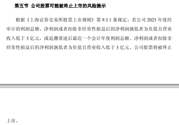 《每日经济新闻·将进酒》记者注意到,尽管上半年净利润实现减亏,但*ST岩石退市风险却在变大。今年4月21日,*ST岩石就曾提示,根据《上海证券交易所股票上市规则》相关规定,若公司2025年度经审计的利润总额、净利润或者扣除非经常性损益后的净利润孰低者为负值且营业收入低于3亿元,或追溯重述后最近一个会计年度利润总额、净利润或者扣除非经常性损益后的净利润孰低者为负值且营业收入低于3亿元,公司股票将被终止上市。