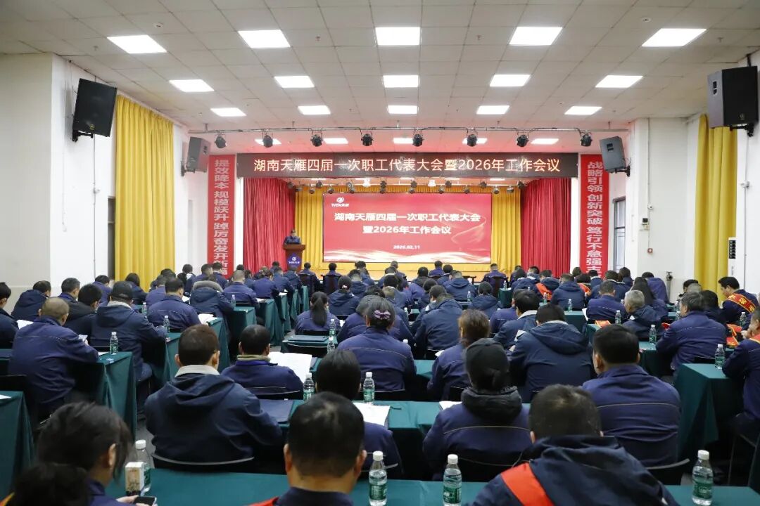 2月11日,湖南天雁召开四届一次职工代表大会暨2026年工作会议,深入贯彻党的二十届四中全会精神和集团公司工作会精神,总结2025年及“十四五”工作成效,科学研判内外部形势,发布”十五五”规划目标,部署安排2026年目标任务与重点举措,动员全体干部职工凝心聚力、实干攻坚,全力打好“十五五”开局主动仗。