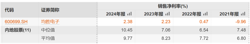 在净利率方面,2024年,均胜电子的净利率为2.38%,而同期汽车零配件上市公司的净利率平均值为9.77%,行业中位数为10.45%,同样均高于均胜电子。