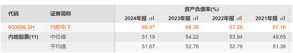 根据2024年年报,均胜电子的资产负债率达到69.07%,较2023年末的66.38%提升了,表明公司存在较高的财务杠杆,可能会增加财务成本和偿债压力。与此同时,与同行相比,数据显示,2024年汽车零配件上市公司的资产负债率平均值为51.67%,行业中位值为51.19%,均低于均胜电子。