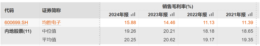 从盈利指标来看,均胜电子的毛利率与净利率均远低于行业均值。数据显示,2024年,均胜电子的毛利率为15.88%,而同期汽车零配件上市公司的毛利率平均值为20.25%,行业中位数为19.26%,均高于均胜电子。