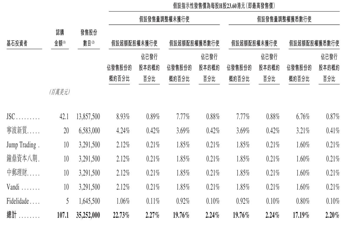 均胜电子基石投资者分别为璟泉均胜旗下JSC、宁波新质、Jump Trading、钟鼎资本八期、中邮理财、建银国际旗下Vandi、复星国际旗下Fidelidade,一共认购1.07亿美元。