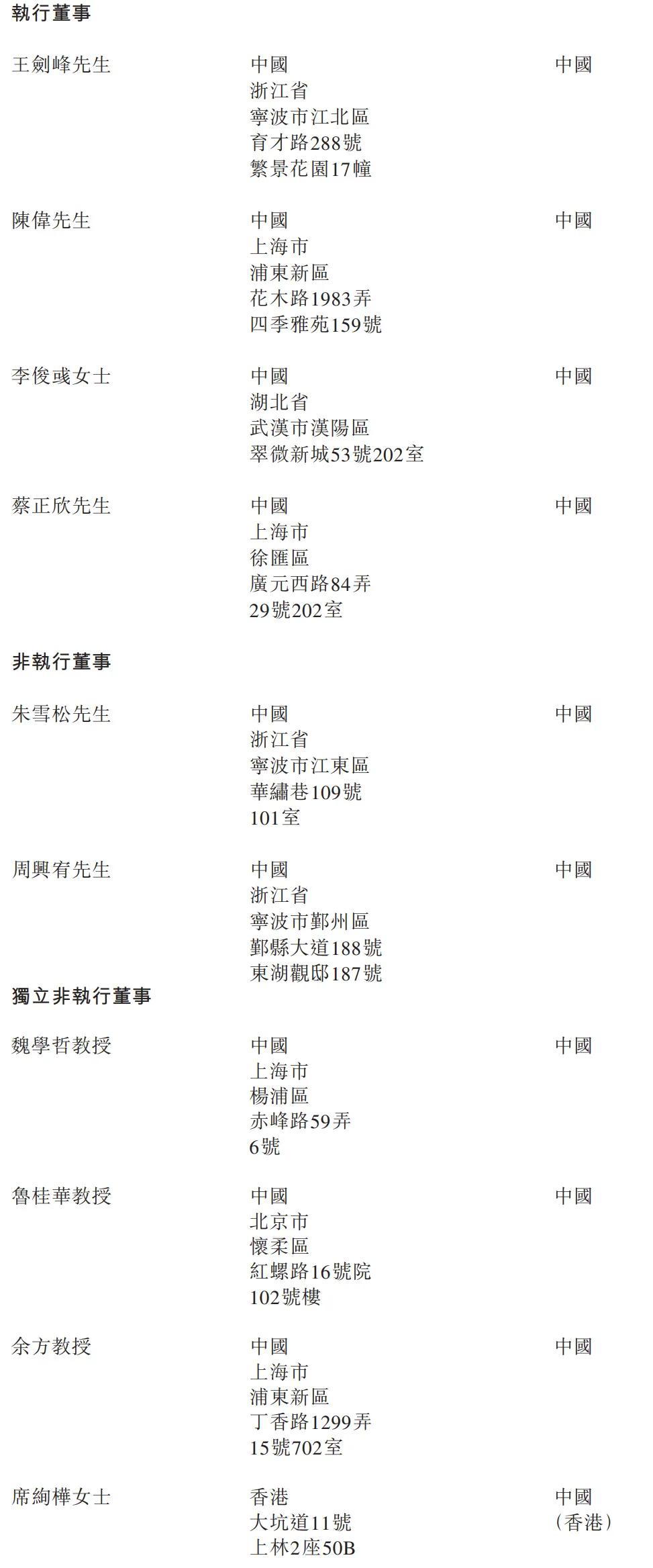均胜电子执行董事分别为王剑峰、陈伟、李俊彧女士、蔡正欣;非执行董事分别为朱雪松、周兴宥;独立非执行董事分别为魏学哲教授、鲁桂华教授。
