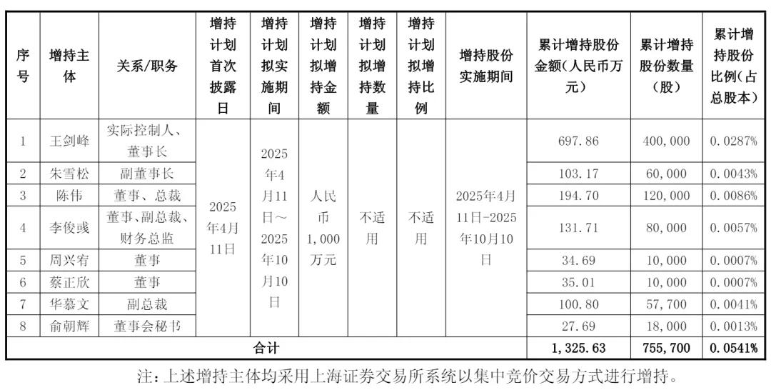 王剑峰等合计8位公司董事/高级管理人员总计增持公司 755,700 股股份,占公司总股本的0.0541%,合计增持金额约1325.6万元。
