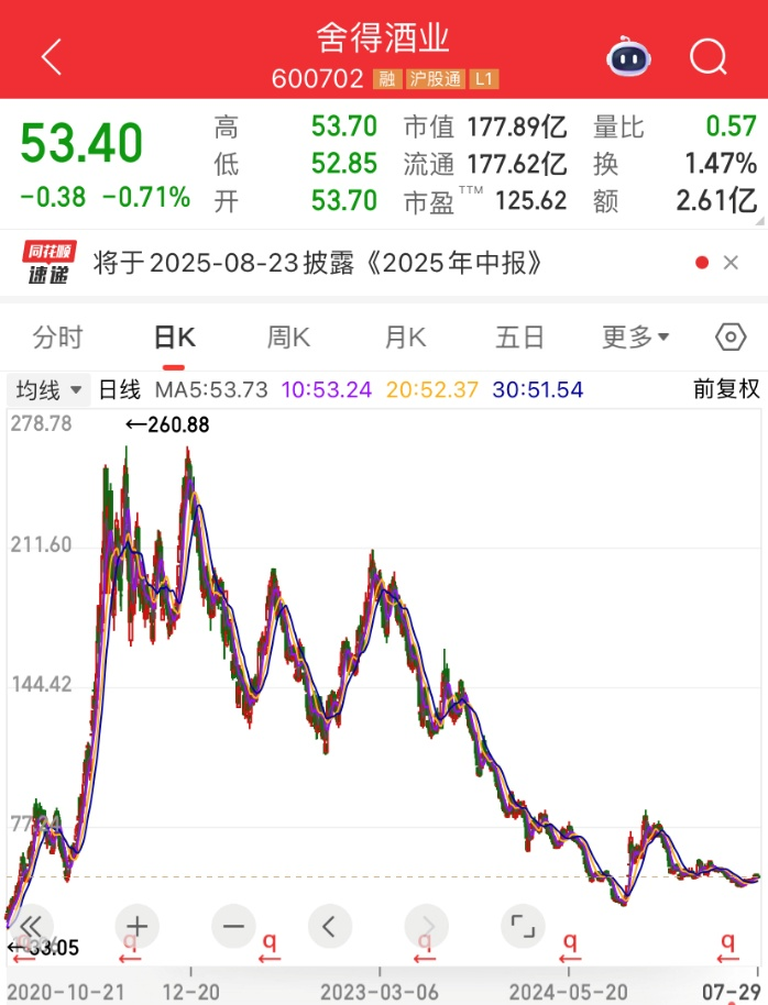 截至7月29日收盘,舍得酒业股价报53.4元,总市值177.89亿元。回顾其股价走势,2020年公司市值曾经历快速攀升,从年初的33.05元低位一路飙升至260.88元的历史高点,对应市值达到869亿元。然而此后股价进入调整周期,经过多次震荡回调,当前股价较历史峰值已累计下跌79.53%,市值缩水明显。