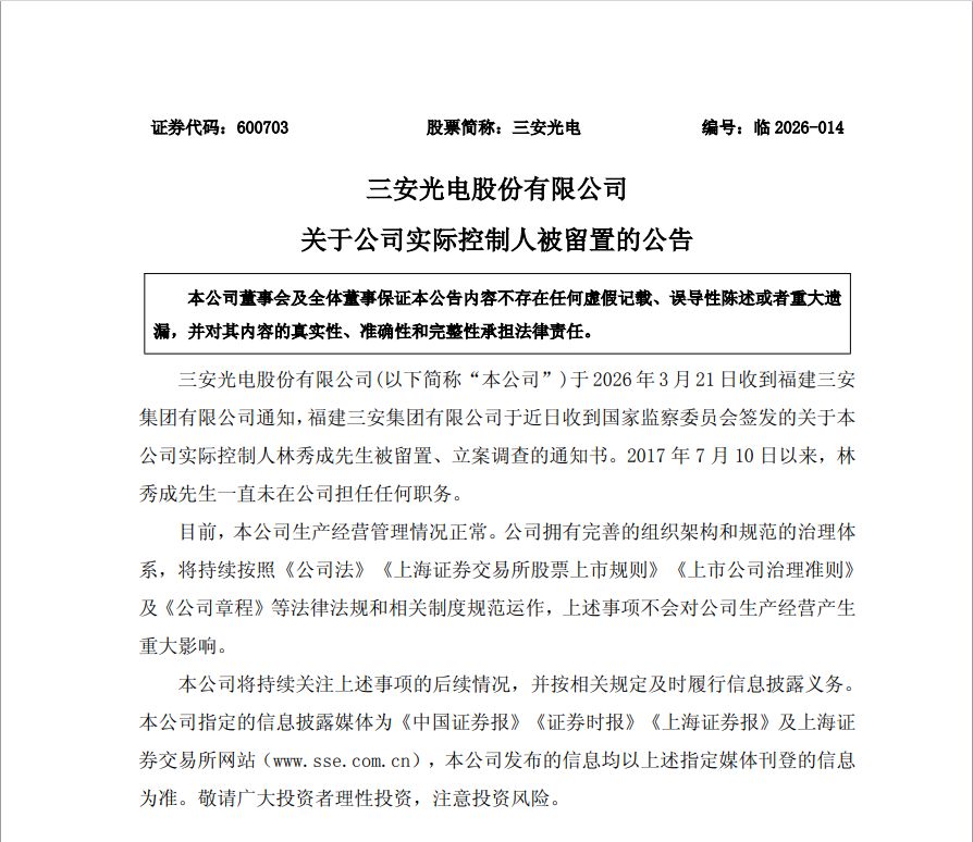 三安光电称,其于2026年3月21日收到福建三安集团有限公司(以下简称“三安集团”)通知,三安集团于近日收到国家监察委员会签发的关于本公司实际控制人林秀成被留置、立案调查的通知书。
