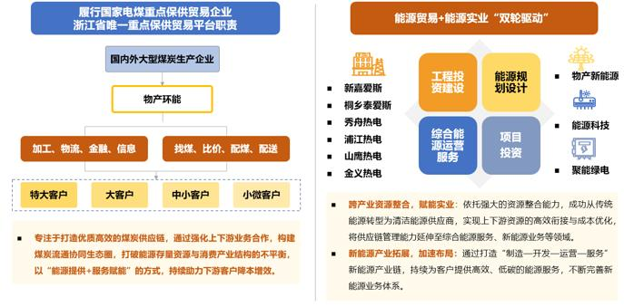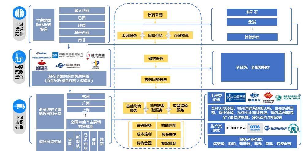 下游围绕中交、中冶、中核、国家能源集团、国家电网、南方电网等核心优质客户,解决原料供给、材料匹配、价格管理、物流规划和金融服务等配供配送基础需求,另外还与浙江省内外的电梯、家电、汽摩配等若干特色产业集群及集装箱、船舶、新能源等大型产业终端建立长期配送服务关系,为大型产业客户及终端产业集群在资源组织、成本控制、库存风险等方面提供一揽子解决方案。