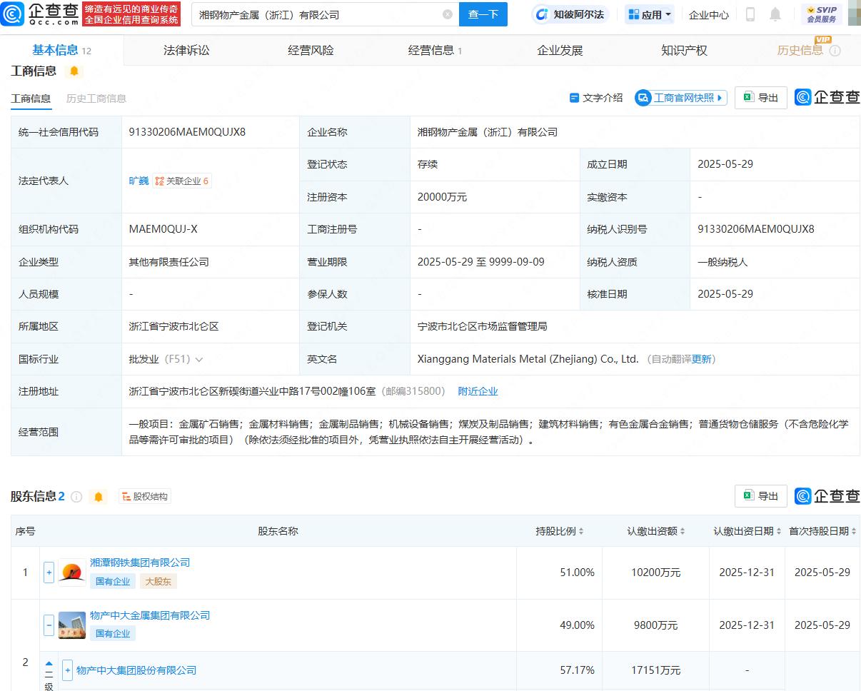 近日,湘钢物产金属(浙江)有限公司成立,法定代表人为旷巍,注册资本为2亿元,经营范围包含:金属矿石销售;金属材料销售;金属制品销售;机械设备销售;煤炭及制品销售;建筑材料销售;有色金属合金销售等。股权穿透显示,该公司由湘潭钢铁集团有限公司、物产中大(600704)旗下物产中大金属集团有限公司共同持股。