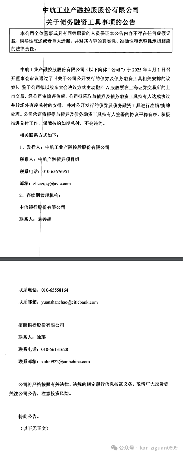 中航工业产融控股股份有限公司(以下简称“公司”)于2025年4月1日召开董事会审议通过了《关于公司公开发行的债券及债务融资工具相关安排的议案》,鉴于公司拟以股东大会决议方式主动撤回A股股票在上海证券交易所的上市交易,经公司审慎评估后,公司拟采取与债券及债务融资工具持有人达成协议并转场外有序兑付的安排,并对公开发行的债券及债务融资工具进行注销/摘牌处理。公司承诺将根据与债券及债务融资工具持有人签署的协议平稳有序、积极推进兑付工作,保障按约如期兑付,不会违约。