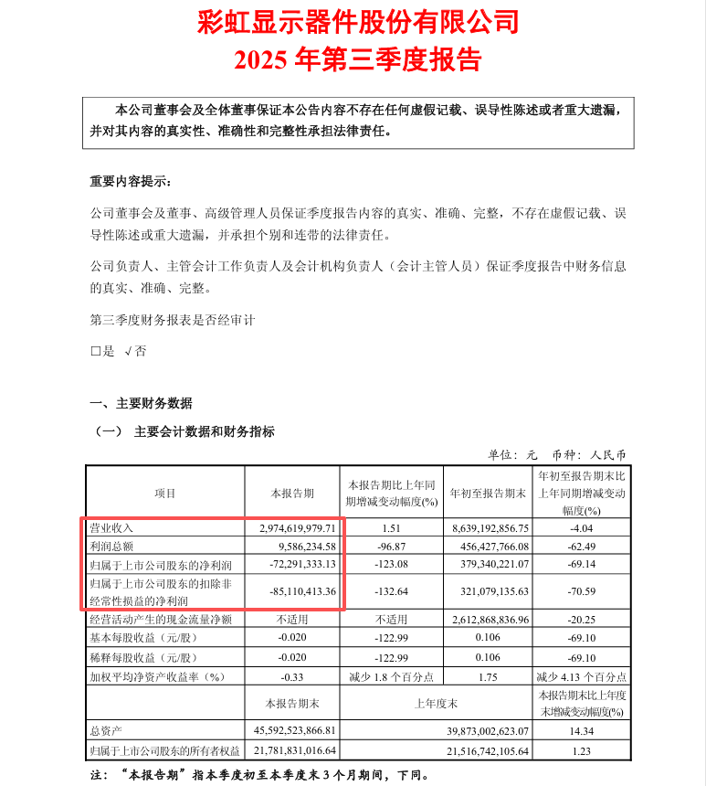 10月30日晚间,彩虹显示器件股份有限公司(证券代码:600707,简称“彩虹股份”)发布 2025 年第三季度报告。报告显示,公司三季度营收实现微增,但受面板价格下滑、费用增加等因素影响,盈利指标同比大幅承压,单季度净利润由盈转亏,年初至报告期末净利润亦显著下降。