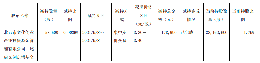 乐居财经刘治颖 11月5日,文投控股(SH600715)公告,因部分基金份额持有人赎回,北京市文化创意产业投资基金管理有限公司-屹唐文创定增基金(以下简称“屹唐文创定增基金”)于2021年9月8日通过上海证券交易所集中竞价交易方式减持公司股份5.35万股,占公司总股份的0.0029%减持。