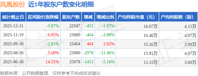 从股价来看,2025年11月19日至2025年12月31日,凤凰股份区间跌幅为3.97%,在此期间股东户数减少453.0户,减幅为1.97%。