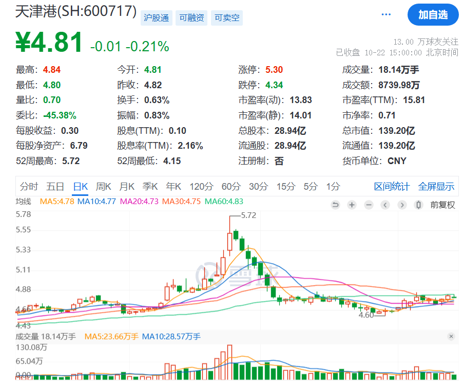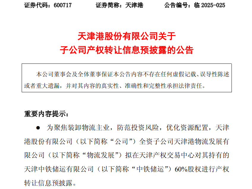 10月22日,天津港子公司天津港物流发展有限公司拟在天津产权交易中心预挂牌转让其持有的天津中铁储运有限公司60%股权,转让底价将以资产评估结果确定,受让方将公开征集。