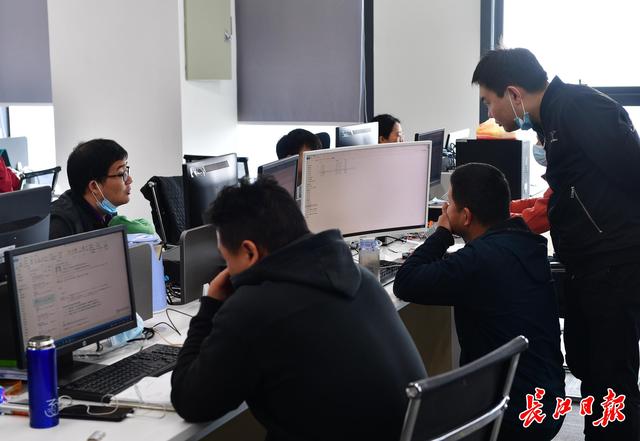 4月1日,东软集团武汉公司,工程师们在编写汽车软件代码。记者李永刚摄