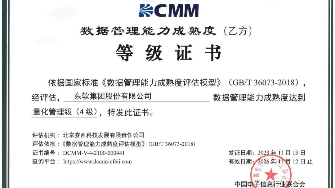 东软集团成功获评DCMM四级(量化管理级)。