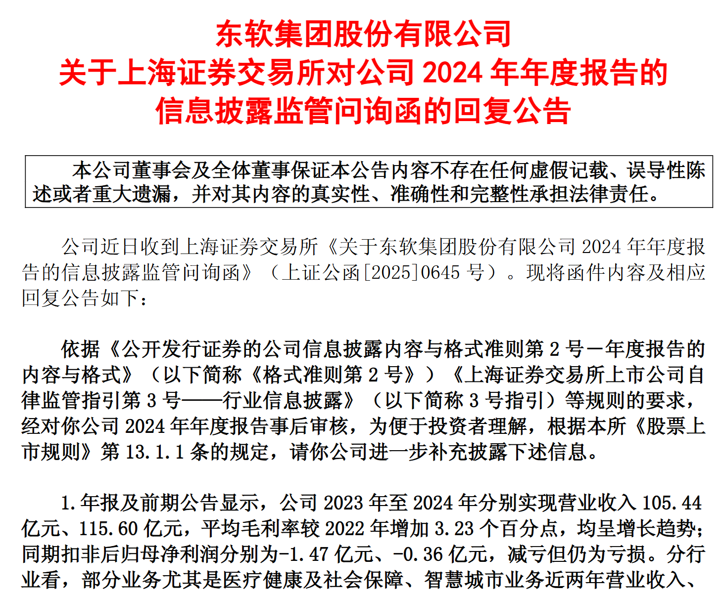 年营收增长9.64%突破百亿元规模,扣非归母净利润却连续亏损,“软件外包巨头”东软集团(SH600718,股价9.42元,市值113.72亿元)受到上交所关注。7月6日晚间,东软集团公告回复上交所年报监管问询函。