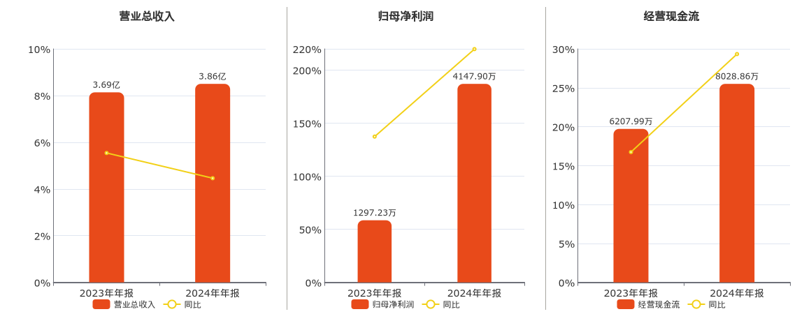 公司营业总收入为3.86亿元。归母净利润为4147.90万元。经营活动现金净流入为8028.86万元。
