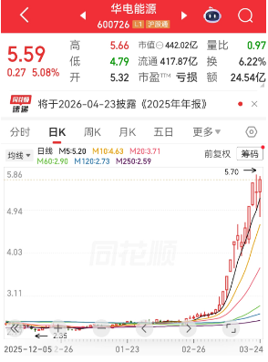3月24日,华电能源(600726)股价大幅波动,该股盘中一度跌停,午后股价大幅拉升并翻红,收盘涨幅5.08%,最新收盘价创近9年来新高。证券时报·数据宝统计,自2026年2月26日以来,该股连续收获多根阳线,目前日K线已录得19连阳,成为近3年来连阳天数最高的股票。日K线连阳期间,华电能源股价累计涨幅111.74%。